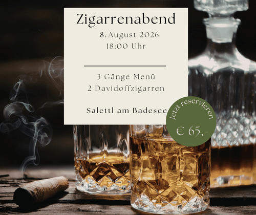 Wir laden Sie herzlich ein, den Abend mit einem exquisiten 3-Gang-Menü zu beginnen, das kulinarische Highlights mit feinen Aromen vereint. Im Anschluss genießen Sie zwei ausgewählte Davidoff Zigarren – perfekt abgestimmt für einen genussvollen Ausklang. Freuen Sie sich auf einen Abend voller Geschmack, Geselligkeit und exklusiver Momente – ideal für Genießer und Liebhaber besonderer Erlebnisse.