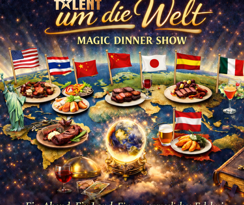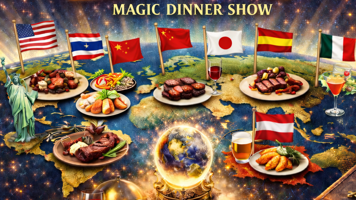 Unsere Dinner Magic Show führt Sie durch sechs faszinierende Destinationen – Österreich, Spanien, Italien, die USA, Frankreich und Asien – und vereint exklusive Themenabende mit außergewöhnlichem Genuss, stimmungsvoller Musik und beeindruckender Magie.