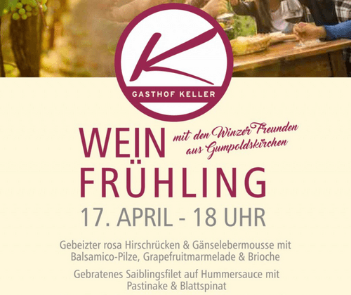 Am Freitag, den 17. April 2026, laden wir Sie herzlich zu unserem exklusiven Weinfrühlingsmenü um 18:00 Uhr ein.