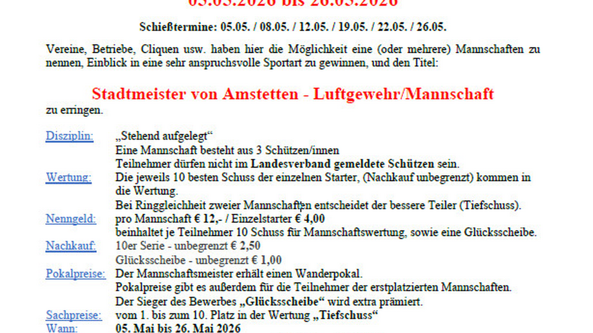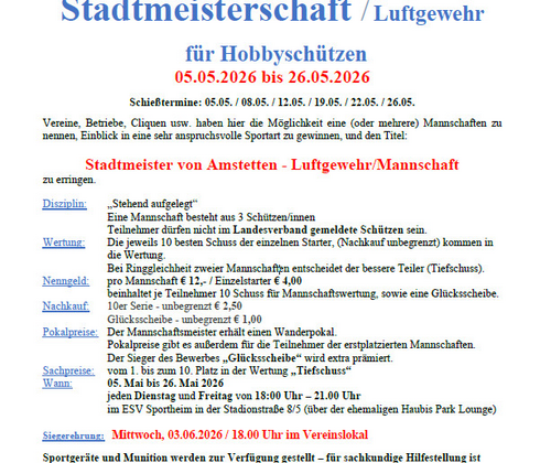13. Amstettner Stadtmeisterschaft / Luftgewehr Hobbyschützen 18:00 Uhr