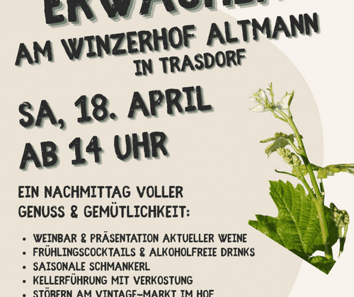 Das Frühlingserwachen am Winzerhof Altmann in Trasdorf lädt am Samstag, 18. April 2026 zu einer besonderen Weinverkostung in Niederösterreich ein.