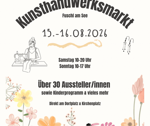 Unter der Organisation von Marie's Nähwerkstatt – Schneidermeisterin aus Leidenschaft findet der erste Kunsthandwerksmarkt in Fuschl am See mit über 30 Ausstellerinnen und Ausstellern statt. Lassen Sie sich von freischaffenden Künstlerinnen und Künstlern und ihren einzigartigen Werken verzaubern. Ein abwechslungsreiches Kinderprogramm rundet den gelungenen Familienausflug ab