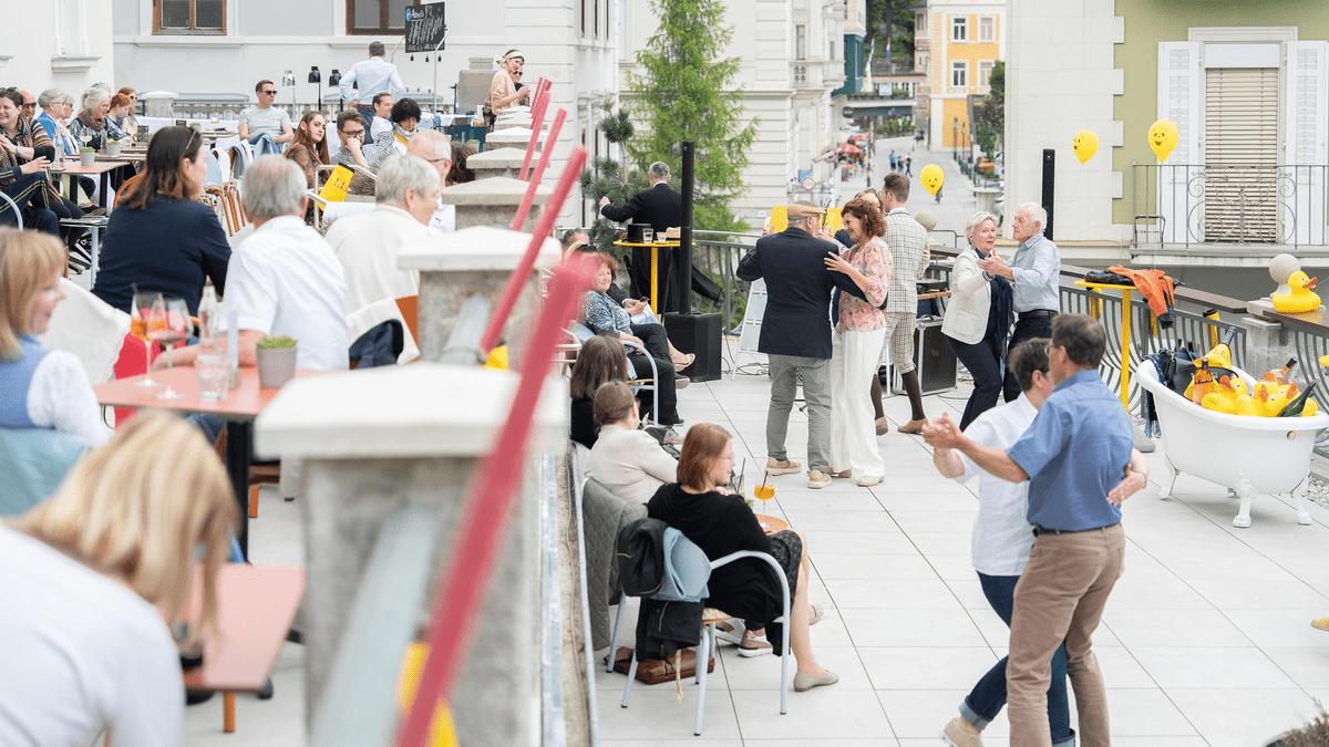 Oberstleutnat Roland Schmieder und Sir Henry de Winter laden zum traditionellen Tanztee auf die Badeschloss-Terrasse ein. Zu den Klängen aus dem vergangenen Jahrhundert wird Fox, Jive & Co getanzt. Die historische Atmosphäre am Straubinger Platz bringt den Charme längst vergangener Zeiten zurück in die Gegenwart.