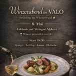 Genießen Sie erstklassige Weine direkt vom Winzer eingeschenkt und kommentiert. Dazu serviert das Valo Team ein festliches 4-Gänge-Frühlingsmenü, perfekt abgestimmt auf die edlen Tropfen.