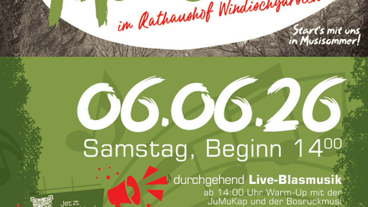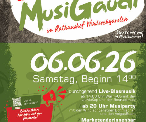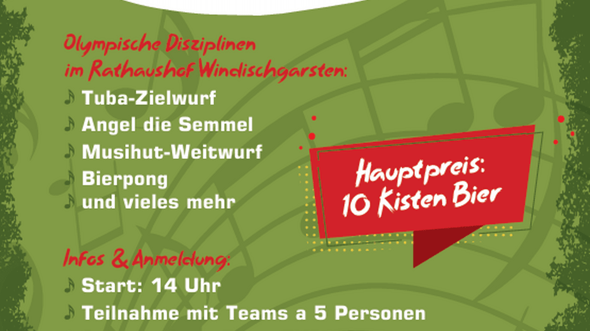 durchgehend Live-Blasmusikab 14:00 Uhr Warm-Up mit der JuMuKap und der Bosruckmusiab 20 Uhr Musiparty mit der Windischgarstner Böhmischen und den VoigasBuamMarketenderinnenbarAnmeldung zum Blechathlon: unter www.mv-windischgarsten.at/musigaudi oder per WhatsApp an 0660 2257050Olympische Disziplinen im Rathaushof Windischgarsten:Tuba-Zielwurf Angel die Semmel Musihut-Weitwurf Bierpong und vieles mehrInfos & Anmeldung: Start: 14 Uhr Teilnahme mit Teams a 5 PersonenStartgeld pro Team EUR 50,- (Inklusive einem Essen und zwei Getränken pro Person)Anmeldung bis zum 30.05.2026 unter www.mv-windischgarsten.at/musigaudi oder per WhatsApp an 06602257050Mehr Infos & Updates (sowie Geheimtipps- & Tricks) auf Instagram musi_windischgarsten