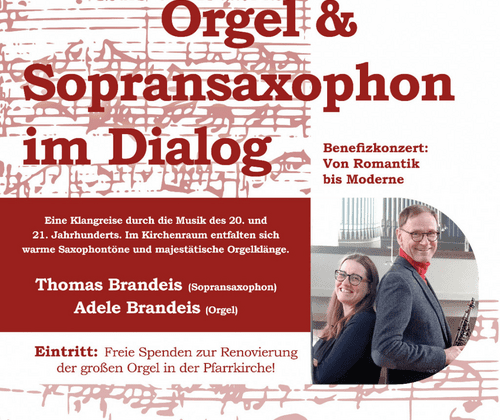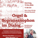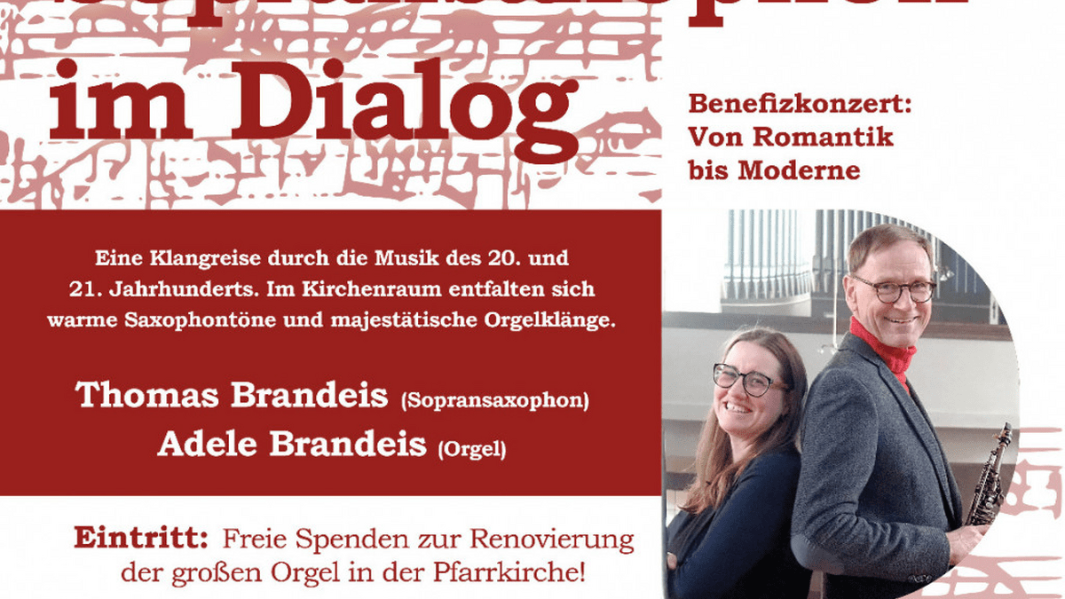Ein besonderes musikalisches Erlebnis erwartet Besucherinnen und Besucher am Sonntag, 19. April 2026, um 17:00 Uhr in der Herz-Jesu-Kirche Gmünd-Neustadt. Unter dem Titel „Sopransaxophon & Orgel im Dialog: Von Romantik bis Moderne“ gestalten Thomas Brandeis (Sopransaxophon) und Adele Brandeis (Orgel) ein Benefizkonzert zugunsten der Renovierung der großen Orgel der Pfarrkirche.