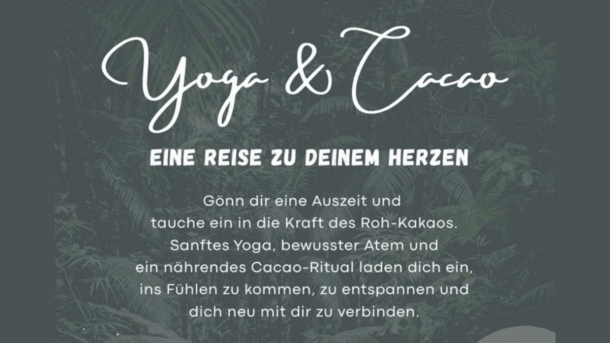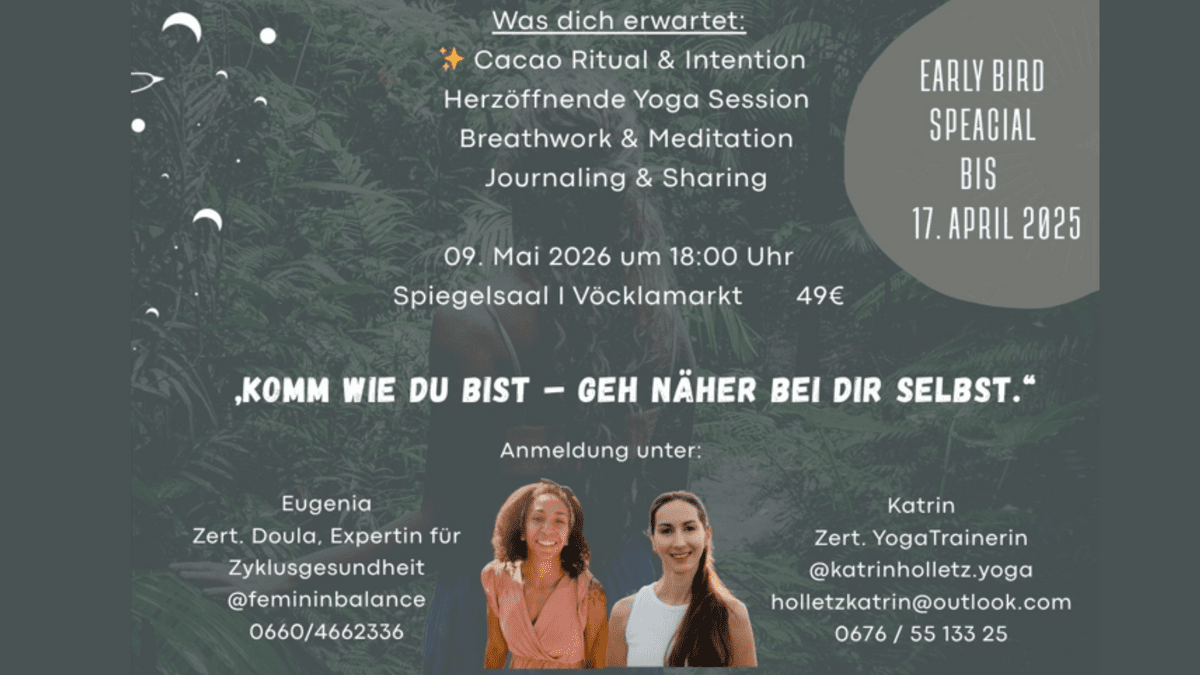 Tauche ein in eine besondere Auszeit für Körper, Geist und Herz: Am 09. Mai 2026 um 18:00 Uhr laden wir dich herzlich zu unserem Event „Yoga & Cacao – Eine Reise zu deinem Herzen“ im Spiegelsaal in Vöcklamarkt ein.Erlebe einen Abend voller Achtsamkeit, Verbindung und innerer Ruhe. Dich erwartet eine harmonische Kombination aus sanftem Yoga, bewusstem Atem, Meditation und einem nährenden Cacao-Ritual. Der Rohkakao unterstützt dich dabei, dein Herz zu öffnen, tiefer ins Fühlen zu kommen und dich neu mit dir selbst zu verbinden. Ergänzt wird die Erfahrung durch Journaling und achtsamen Austausch in einer geschützten Atmosphäre.Das Event wird von Eugenia, zertifizierte Doula und Expertin für Zyklusgesundheit, sowie Katrin, zertifizierte Yogatrainerin, begleitet.💫 Datum & Uhrzeit: 09. Mai 2026, 18:00 Uhr
