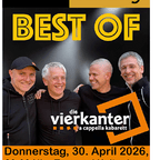 DIE VIERKANTER - kommen mit ihrem ersten „BEST OF-Programm“.Seit bald 30 Jahren sind die Freunde, Weggefährten und Bühnenbrüder bekannt als "Vierkanter" die originellste und charmanteste A-cappella-Kabarettgruppe des Landes.Was 1997 mit Gesangsexperimenten, Wortspielen und einer gesunden Portion Selbstironie begann, hat sich zu einer einzigartigen Mischung aus mehrstimmigem Gesang, mehrdeutigem Kabarett und eindeutigem, fein dosierten Nonsens entwickelt.Zeitlose Highlights wie "Radar" gespickt mit brandneuen Titeln - ein BEST OF, ein musikalisches Feuerwerk mit Charme, Witz und Tiefgang.