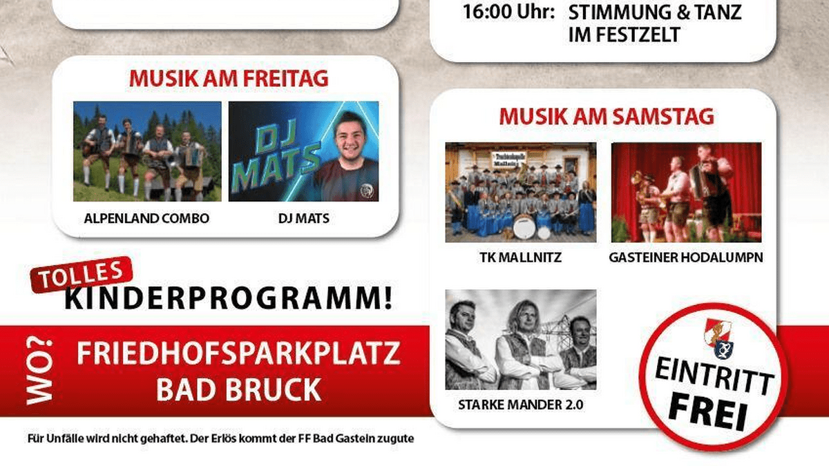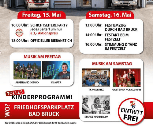 Samstag 16. Mai13:00 Uhr Festumzug durch Badbruck14:00 Uhr Festakt beim Festzelt16:00 Uhr Stimmung & Tanz im FestzeltMusik: TK Mallnitz, Gasteiner Hodalumpn, Starker Mander2.0