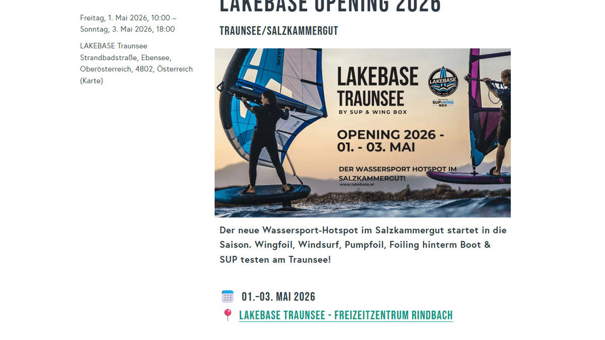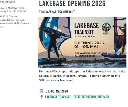 Von 1. bis 3. Mai 2026 eröffnet in Rindbach bei Ebensee die Lakebase Traunsee – ein Treffpunkt (neu übernommen) für alle, die Wasser, Wind und Bewegung lieben. Drei Tage lang wird getestet, ausprobiert, gelernt und gefeiert. Wer Wassersport einmal anders erleben möchte, ist hier genau richtig.