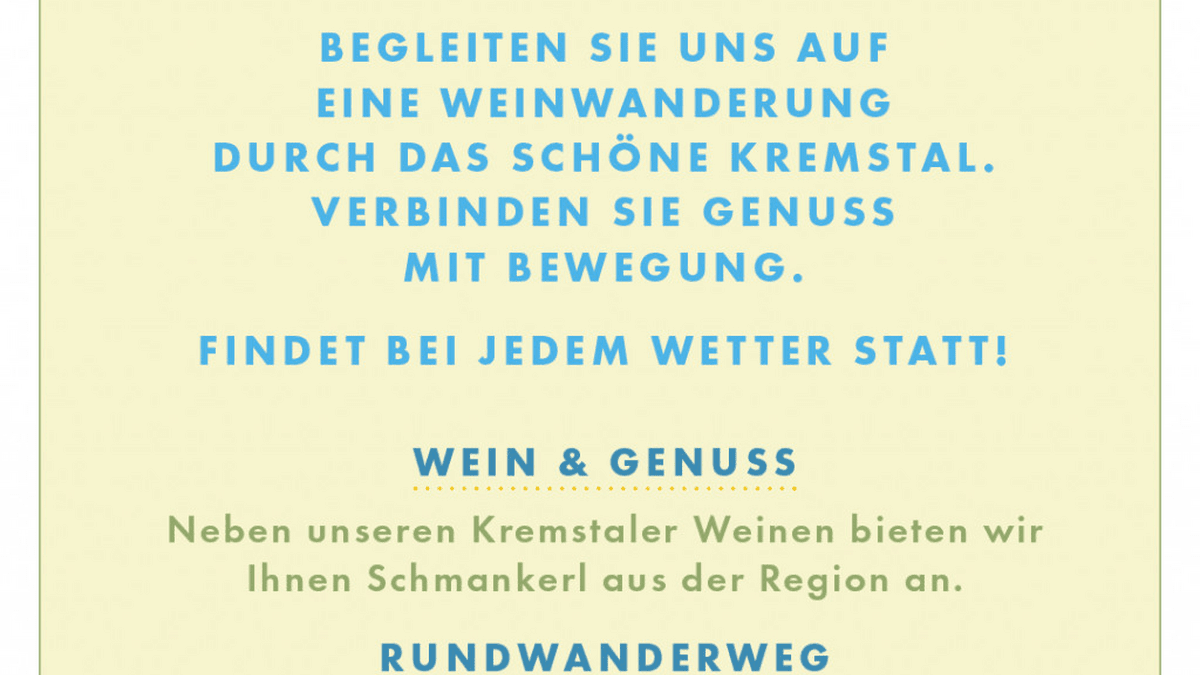 4 Winzer: Faltl- Hagmann-Czipin-Rath verwöhnen Sie mit Wein und Genuss auf der Wanderstrecke. Neben Kremstaler Weinen werden auch Schmankerl aus der Region angeboten. Start ist überall möglich, Parkplätze bei jedem Weingut ausreichend vorhanden, 4 Spielplätze entlang der Strecke, kinderwagentaugliche Route!
