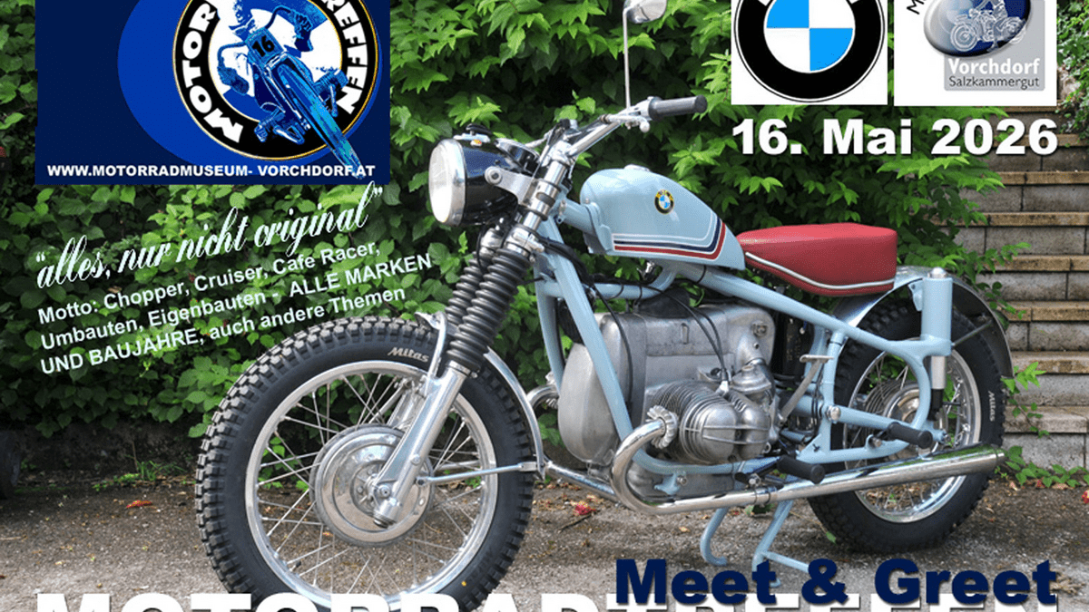 Das breitgestreute Motto diesmal: „alles, nur nicht original“ … weil der Event aber sein 10jähriges Jubiläum feiert, könnte der Titel auch lauten: „bringt was Ihr wollt, zeigt uns, was Ihr habt …“.Wer ein zu diesem Thema passendes Motorrad, Moped oder einen Roller in seiner Garage stehen hat und den vor Ort gerne herzeigen möchte, bitte um Anmeldung unter benzinradl@gmx.at … weitere Infos auf www.motorradmuseum-vorchdorf.at oder auf www.benzinradl.at oder Tel. 0664/1521264Wie jedes Jahr beim Meet & Greet besteht auch heuer wieder die Möglichkeit, die allerneuesten BMW Motorräder Probe zu fahren. Die Firmen Geyrhofer und Kreupl bringen wieder eine ganze Armada an 2025er Modellen, mit denen man in einer kleinen Gruppe unter ortskundiger Führung zu einer halbstündigen Ausfahrt ins Almtal teilnehmen kann.