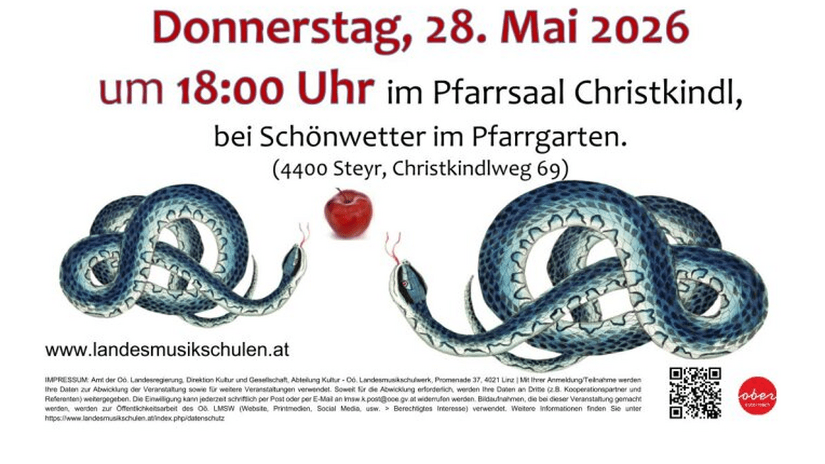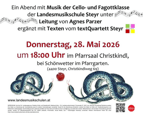 Ein Abend mit Musik der Cello- und Fagottklasse der Landesmusikschule Steyr unter Leitung von Agnes Parzer ergänzt mit Texten vom textQuartett Steyr.Das musikalische und inhaltliche Thema lautet: Verschwörungen und Intrigen.Lassen Sie sich überraschen. Musik & Spannung garantiert 👀Eintritt frei, Spenden erbeten.