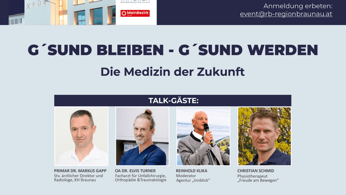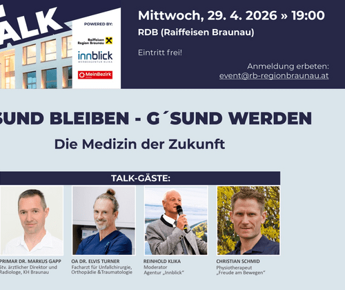 Mittwoch, 29. April 2026, 19:00 UhrDas Talk-Format „REINI`S TALK“ im RDB Braunau. Diesmal zum Thema: „G´sund bleiben – G´sund werden“ – Die Medizin der Zukunft!Moderator: Reinhold Klika