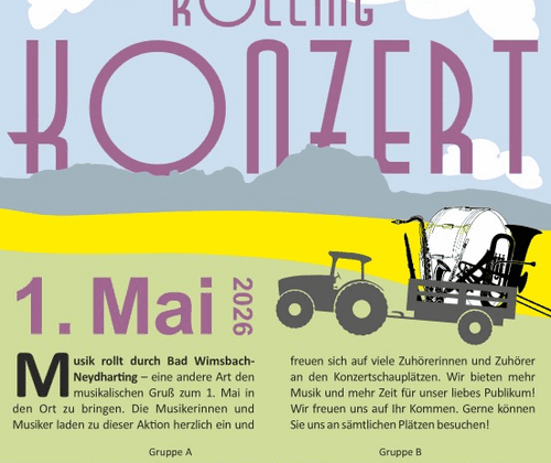 Musik rollt durch Bad Wimsbach-Neaydharting - eine andere Art den musikalischen Gruß zum 1. Mai in den Ort zu bringen. Die Musiker:innen laden zu dieser Aktion herzlich ein und freuen sich auf viele Zuhörer:innen an den Konzertschauplätzne. Wir bieten mehr Musik und mehr Zeit für unser liebes Publikum!