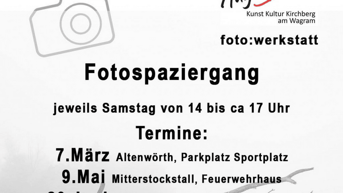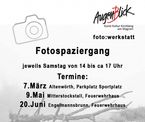 Die foto:werkstatt des Vereins Kunst Kultur Kirchberg am Wagram bietet drei Termine für Fotospaziergänge an. Jeder Fotospaziergang ist thematisch abgeschlossen.
