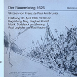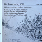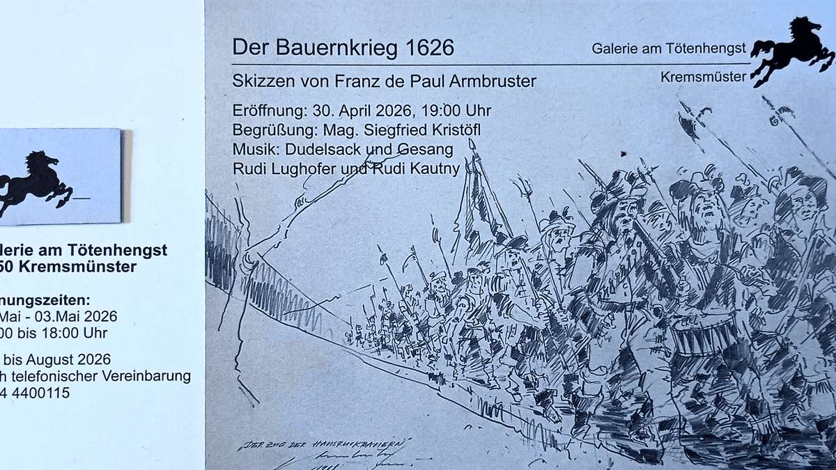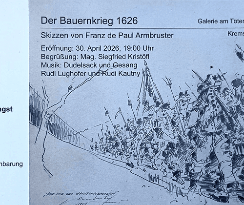 Skizzen von Franz de Paul ArmbrusterAm 30. April um 19 Uhr eröffnet Franziska Armbruster die Ausstellung "Der Bauernkrieg 1626" in der Galerie am Tötenhengst. Die Skizzen wurden 1988 in Buchform veröffentlicht. Aus aktuellem Anlass (400 Jahre seit 1626) zeigt die Galerie die Originalarbeiten von Franz de Paul Armbruster. Die damaligen Ereignisse gingen auch an Kremsmünster nicht vorbei; dazu gibt Siegfried Kristöfl eine Einordung des Geschehens und findet Rudi Lughofer (Dudelsack) gemeinsam mit Rudi Kautny (Gesang) die richtigen Töne.Galerie am TötenhengstÖffnungszeiten:
