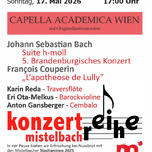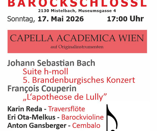 Im Rahmen der Konzertreihe des Vereins Internationale Meisterkurse Mistelbach präsentieren sie Meisterwerke der barocken Kammermusik auf Originalinstrumenten mit Kompositionen von Johann Sebastian Bach und François Couperin.