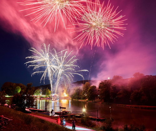 Entlang der Donau begleiten traditionell stimmungsvoll beleuchtete Schiffe den Feuerzauber Nibelungengau.