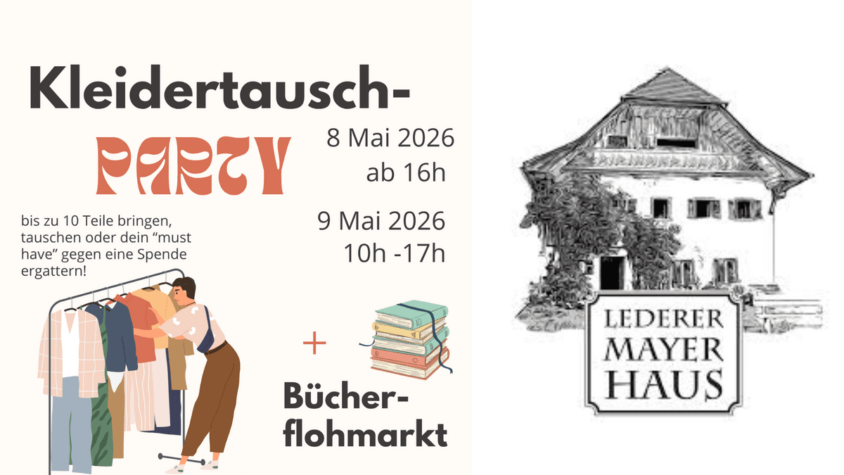 Kleidertauschparty im LederermayerhausAm 8. Mai ab 16 Uhr und am 9. Mai von 10 bis 17 Uhr wird das Lederermayerhaus zum Treffpunkt für alle, die Mode lieben und nachhaltig denken!Bring bis zu 10 gut erhaltene Kleidungsstücke mit und tausche sie gegen neue Lieblingsstücke ein. Vielleicht findest du genau dein nächstes „Must-have“ – und das ganz ohne schlechtes Gewissen. Wer nichts zum Tauschen dabeihat, kann tolle Teile auch gegen eine Spende ergattern.Neben der Kleidertauschparty lädt ein gemütlicher Bücherflohmarkt zum Stöbern ein. Entdecke spannende Geschichten, inspirierende Werke oder einfach dein nächstes Lieblingsbuch.Komm vorbei, bring Freund:innen mit und genieße zwei Tage voller Austausch, Nachhaltigkeit und guter Stimmung!