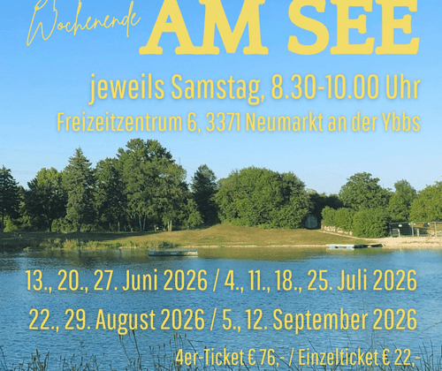 Bei Yoga am See üben wir Yoga unter freiem Himmel direkt am wunderschönen Naturbadesee im Freizeitzentrum in Neumarkt an der Ybbs. Die Yogastunden finden Samstag morgens statt und wir genießen die Natur und die Ruhe der Morgenstunden während unserer Yogapraxis. Du weckst und mobilisierst sanft deinen Körper und bewegst dich im Rahmen deiner gegenwärtigen Befindlichkeit und anatomischen Gegebenheiten und gönnst dir einen entspannten Start in dein Sommerwochenende!