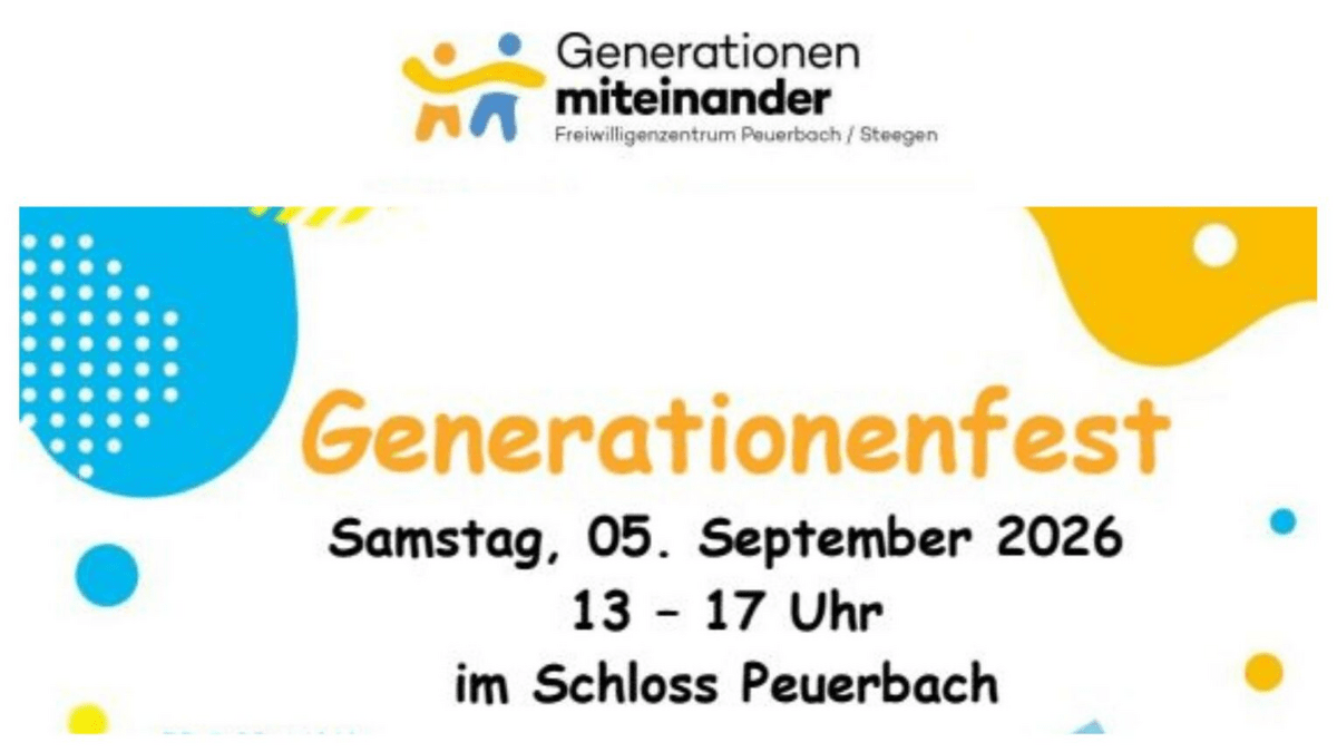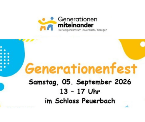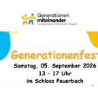 Generationenfest 2026Samstag 05. September 202613:00 - 17:00 Uhr Schloss PeuerbachEin Fest für alle Generationen, bei dem wir miteinander basteln, lesen, spielen und euch noch vieles mehr erwartet.Wir freuen uns auf einen schönen und lustigen Nachmittag.Generationenfest 2026 Flyer