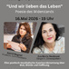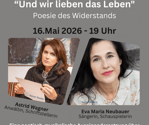 Die Anwältin und Schriftstellerin Astrid Wagner und die Schauspielerin und Sängerin Eva Maria Neubauer gestalten einen vielschichtigen Abend: Texte, Gedanken und Lieder verweben sich zu einer poetischen Auseinandersetzung mit Mut, Würde und Hoffnung.