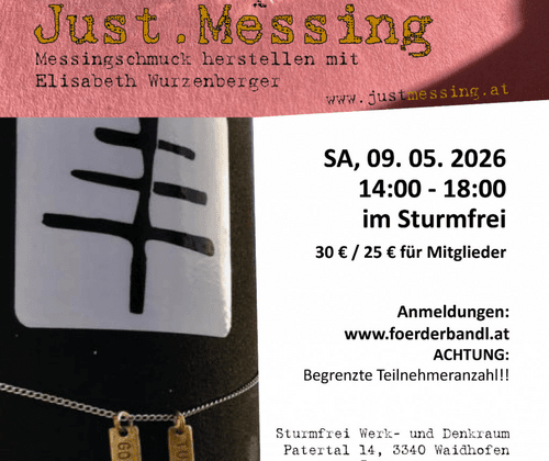 Am Samstag, 09. Mai wird es interessant im Sturmfrei – ab 14:00 werden wir mit Elisabeth Wurzenberger (Just.Messing aus Scheibbs) bis 18:00 Messingschmuck herstellen.