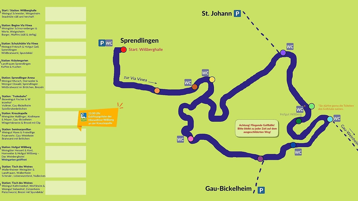 Die Rundwanderung (ca. 10 km) startet an der Wißberghalle in Sprendlingen, wo Informationen zur Wegstrecke bereitgehalten werden. Die Strecke führt entlang der Via Vinea auf den Wißberg. Auf der Strecke geht es unter anderem zum Hofgut Wißberg und zur Kreuzkapelle. Der Rundweg kann in beide Richtungen gelaufen werden.