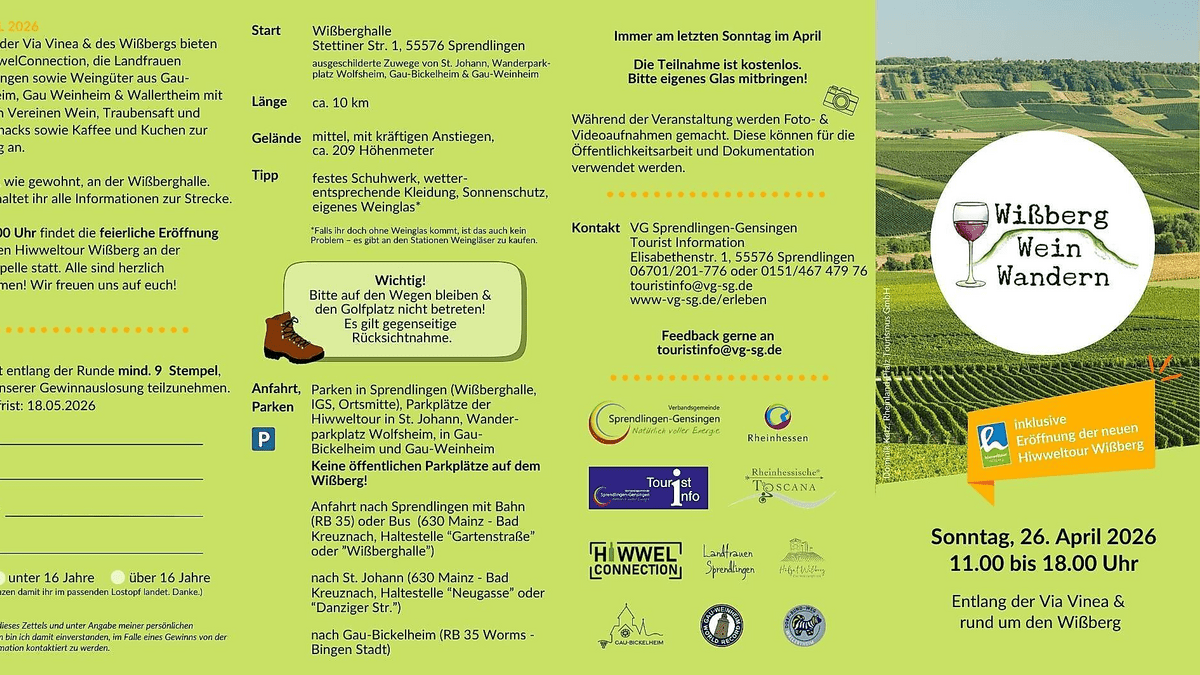 Immer am letzten Sonntag im April findet das WißbergWeinWandern von 11.00 bis 17.00 Uhr statt. Rund um die Via Vinea, entlang der Gau-Bickelheimer Kreuzkapelle und einen Teil des Panoramawanderwegs bieten die HiwwelConnection, die Landfrauen Sprendlingen, das Hofgut Wißberg sowie Gau-Bickelheimer Weingüter Wein, Traubensaft, kleine Snacks sowie Kaffee und Kuchen zur Stärkung an.