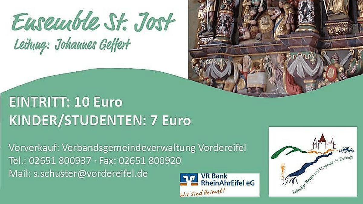 Eintrittskarten zum Preis von 10,00 € erhalten Sie bei Frau Schuster unter der Telefonnummer 02651/8009-37 oder s.schuster@vordereifel.de.