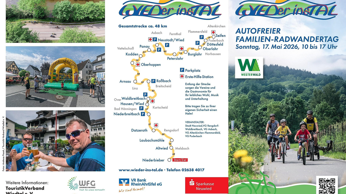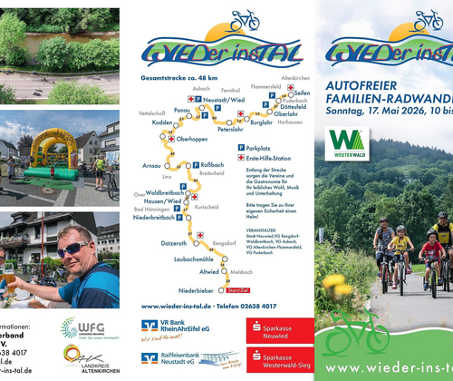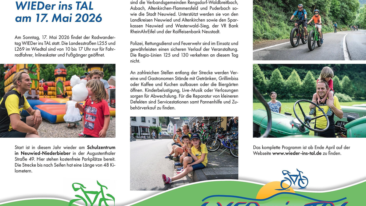 Am Sonntag, 17. Mai 2026 findet von 10:00 – 17:00 Uhr der nächste Radwandertag WIEDer ins TAL statt. Die Landesstraße im Wiedtal ist nur für Fahrradfahrer, Inlineskater und Fußgänger geöffnet.
