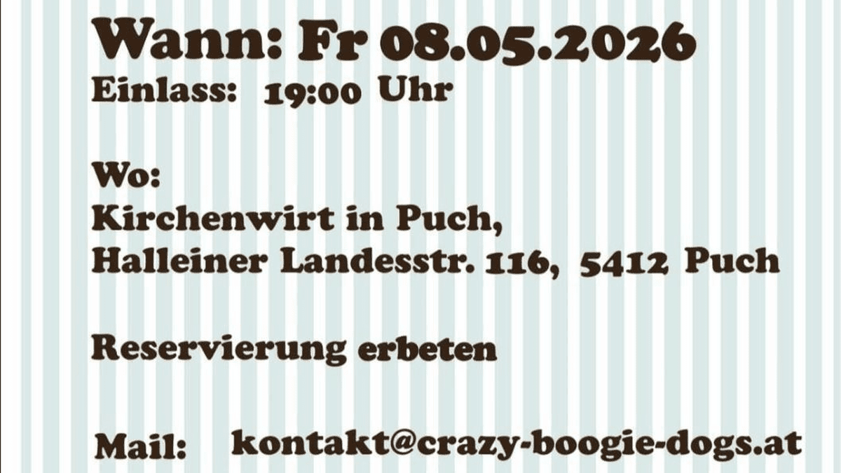Die Crazy Boogie Dogs aus Wals laden wieder zur Boogie Party, einem offenen Tanzabend beim Kirchenwirt in Puch ein.Live-Musik mit Michael Alf Trio und DJ Jürgen.Um Reservierung wird gebeten! Email: mailto: konakt@crazy-boogie-dogs.atUKB: € 12,- pro Personwww.crazy-boogie-dogs.at