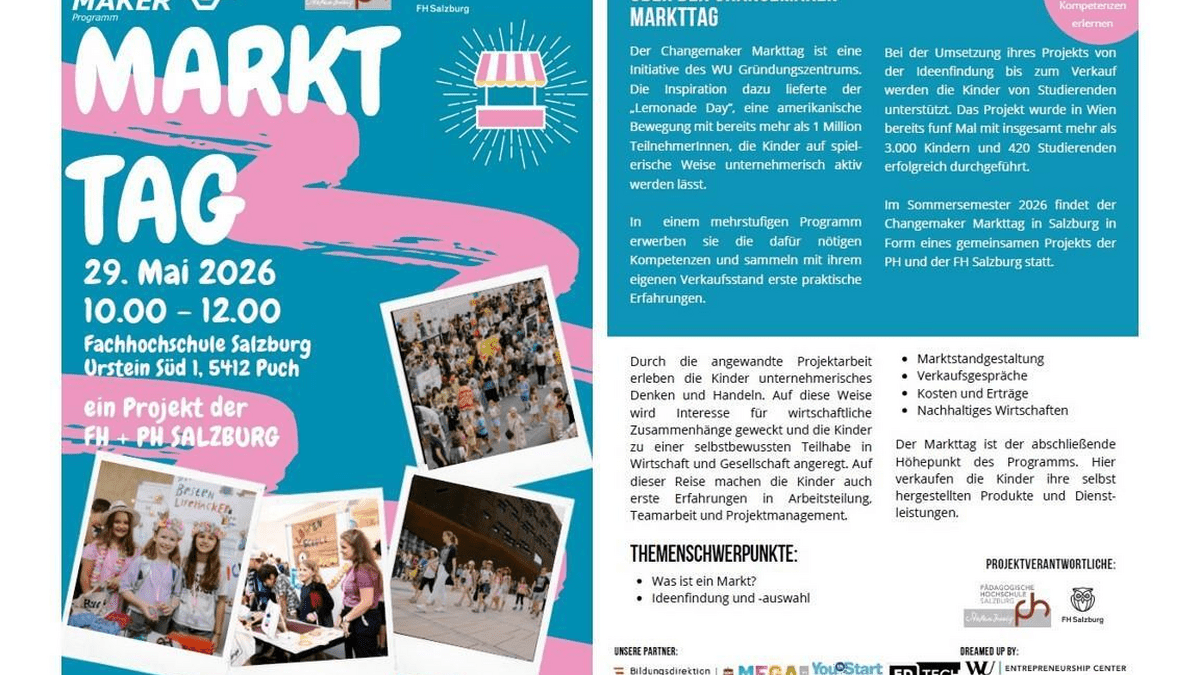 Changemaker University an der FH SalzburgMit dem Changemaker Markttag machen wir unternehmerisches Denken und Handeln für Volksschulkinder erlebbar. Dabei wecken wir Interesse für wirtschaftliche Zusammenhänge und regen die Kinder durch aktive Projektarbeit zu einer selbstbewussten Teilhabe an Wirtschaft und Gesellschaft an. Der Markttag findet schließlich am 29. Mai statt – dabei unterstützen wir die Kinder und betreuen ihre Stände.Der Markttag ist der abschließende Höhepunkt des "CHANGEMAKER" Programms. Hier verkaufen die Kinder der teilnehmenden Volksschulen ihre selbst hergestellten Produkte und Dienstleistungen. Der Changemaker Markttag ist eine Initiative des WU Gründungszentrums. Die Inspiration dazu lieferte der „Lemonade Day“, eine amerikanische Bewegung mit bereits mehr als 1 Million TeilnehmerInnen, die Kinder auf spielerische Weise unternehmerisch aktiv werden lässt. In einem mehrstufigen Programm erwerben sie die dafür nötigen Kompetenzen und sammeln mit ihrem eigenen Verkaufsstand erste praktische Erfahrungen. In der Vorbereitung besuchen wir Volksschulen und erarbeiten gemeinsam mit den Kindern die Grundlagen von unternehmerischem, nachhaltigem Denken und Handeln. Anschließend gestalten die Kinder im Werkunterricht verschiedene Produkte (z. B. Kräutersalz, bemalte Steine, Lesezeichen etc.), die sie beim Markttag – der heuer an der FH Salzburg stattfindet – selbst verkaufen.