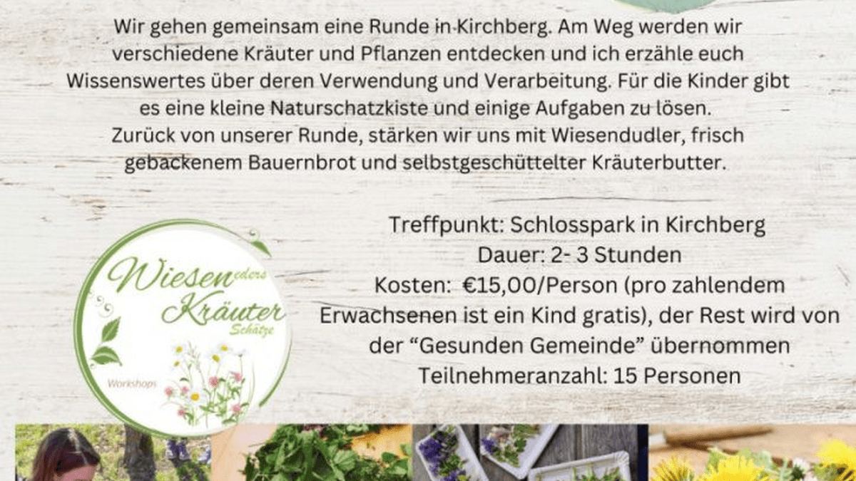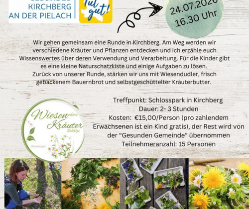 Wir gehen gemeinsam eine Runde in Kirchberg. Am Weg werden wir verschiedene Kräuter und Pflanzen entdecken und ich erzähle euch Wissenswertes über deren Verwendung und Verarbeitung. Für die Kinder gibt es eine kleine Naturschatzkiste und einige Aufgaben zu lösen.