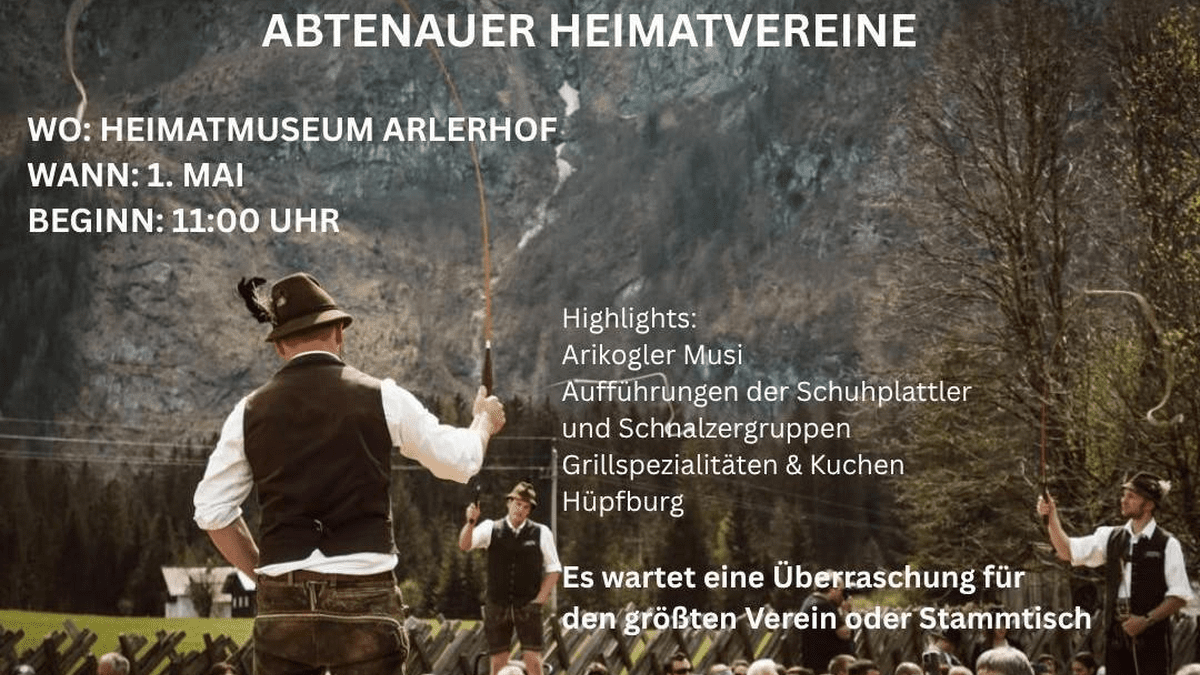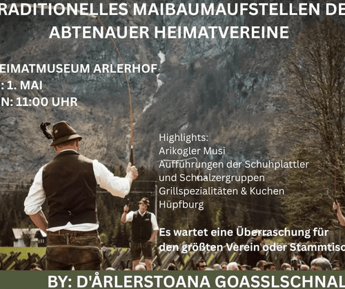 Das Heimatmuseum und die D'Arlerstoana Goasslschnalzer laden zum traditionellen Maibaumaufstellen beim Arlerhof in der Au. Beginn: ab 11:00 Uhr