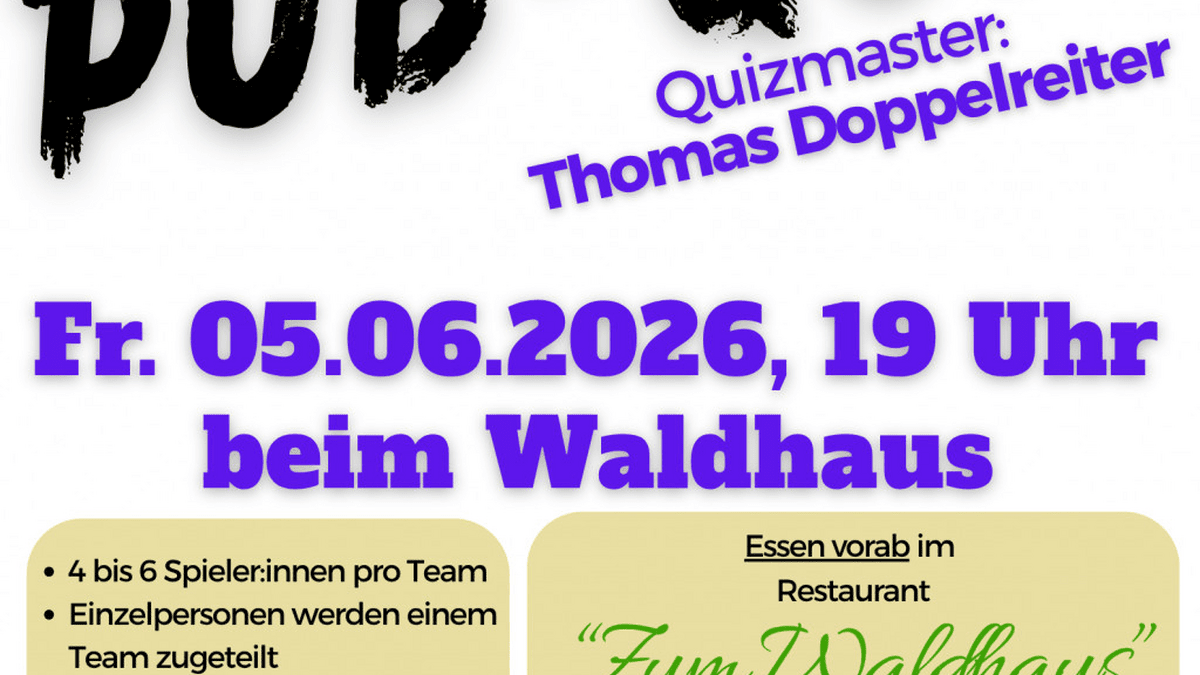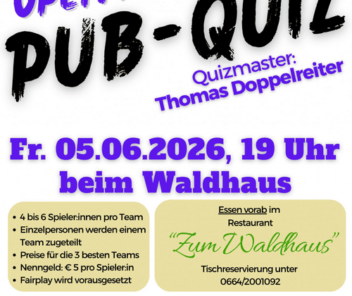 Aufgrund des großen Erfolgs des vergangenen Pub-Quiz in Seebenstein wird zum 3. Mal ein Open Air Pub-Quiz veranstaltet. Jede und jeder ist dazu herzlichen eingeladen. Anmeldung unter https://forms.gle/oMEkvM9VpX8EJ9fo7 möglich, aber nicht verpflichtend