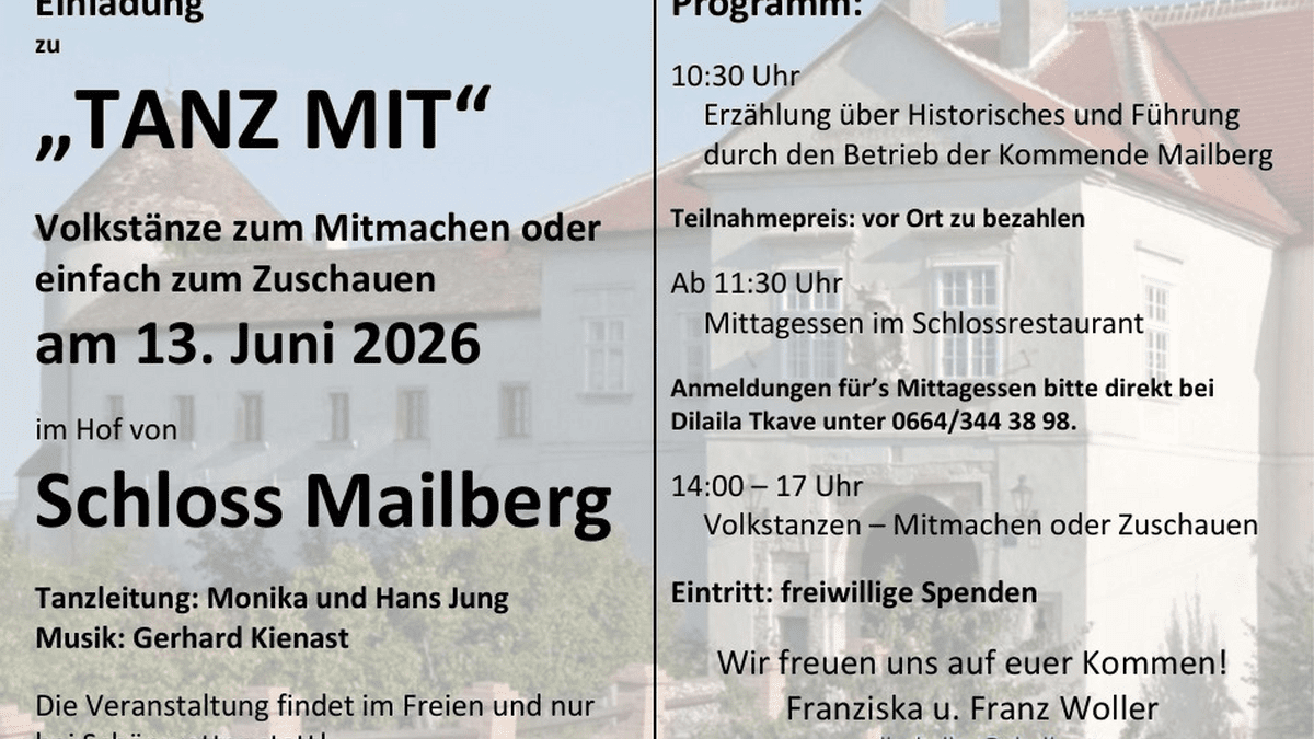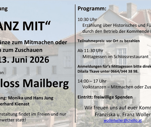 Am Samstag, den 13. Juni 2026 laden Franziska und Franz Woller in den Hof von Schloss Mailberg zum gemeinsamen Tanzen ein.