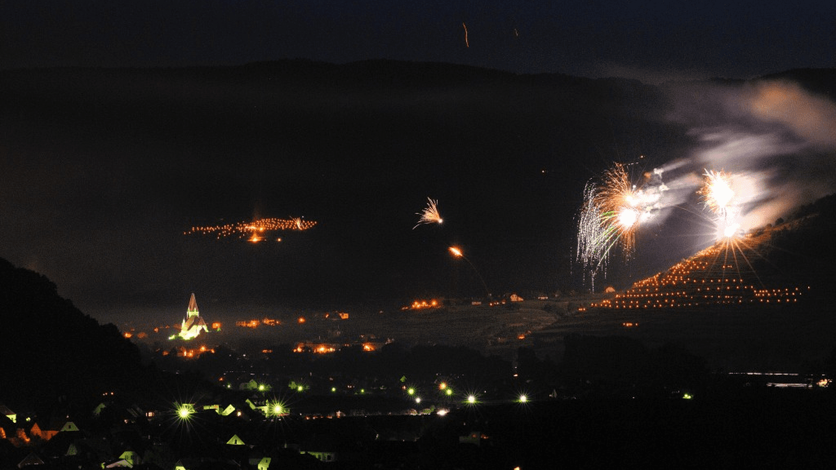 Man kann mit der Rollfähre von Weißenkirchen nach St. Lorenz übersetzen, wo man einen herrlichen Ausblick auf die erhellten Weinberge hat.