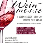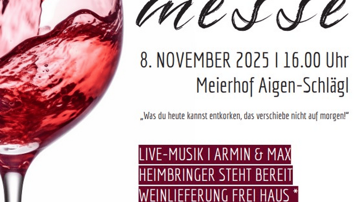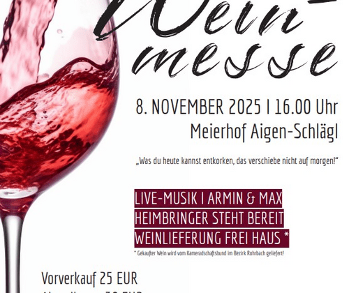 „Was du heute kannst entkorken, das verschiebe nicht auf morgen!“Der Kameradschaftsbund Aigen-Schlägl lädt recht herzlich zur Weinmesse im Meierhof Aigen-Schlägl ein. Samstag, 8. November 2025, 16.00 UhrWeine aus ganz ÖsterreichVerkostung inkl. Mineral, Wasser, Gebäck & Käse und Live-Musik