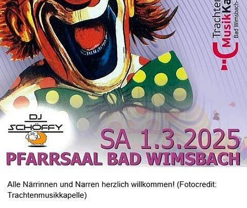Die Trachtenmusikkapelle Bad Wimsbach-Neydharting lädt alle Närrinnen und Narren zum "Wimsbacher Maskenball" herzlich ein. Im Pfarrsaal "fliegen die Löcher aus dem Käse und jetzt geht sie los, unsere Polonäse Blankenese". Wir freuen uns auf zahlreiche Faschingsnarren!