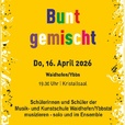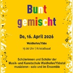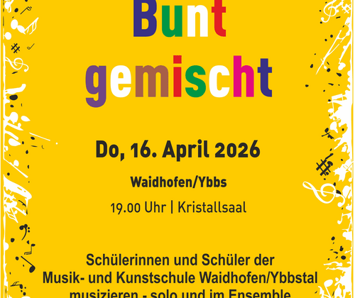 Junge Nachwuchsmusikerinnen und -musiker dürfen wieder ihr musikalisches Können und ihre Bühnenpräsenz beim jährlichen „Bunt gemischt“- Konzert präsentieren. Solistinnen/Solisten und Ensembles aus mehreren Fachgruppen bringen Musikstücke von unterschiedlichen Spielniveaus auf die Bühne. Ein abwechslungsreiches Programm zeigt die künstlerische Vielfalt der Musikschülerinnen und Musikschüler. Den Zuschauern wird dabei eine bunte Mischung an Musikstücken quer durch die Musikgeschichte und verschiedene Genres geboten. Eintritt frei!