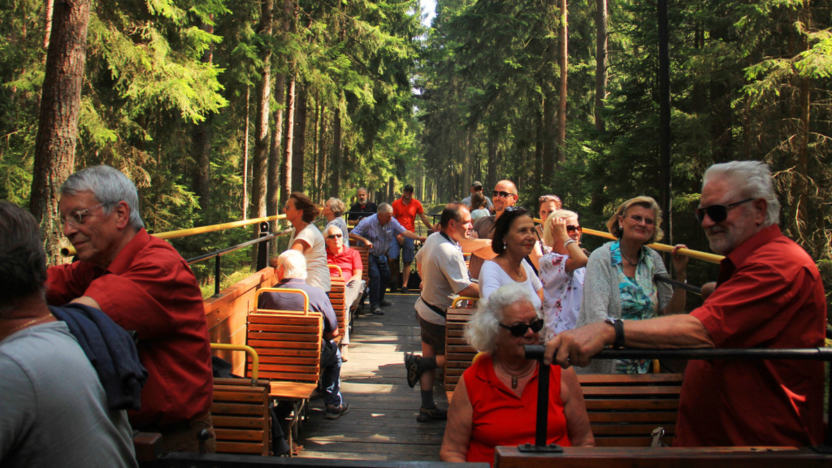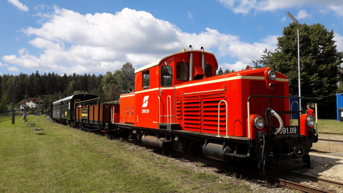 Steigen Sie ein und genießen Sie auf den offenen Plattformwagen eine Fahrt durch die urwüchsige Landschaft. In jedem Zug läuft unser Jausenwagerl und der Cabrio-Wagen (bei Schönwetter) mit.