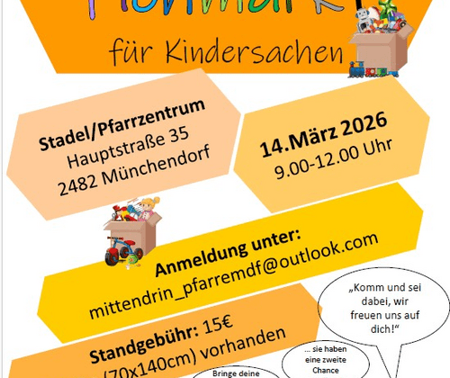 Anmeldung unter mittendrin_pfarremdf@outlook.com Vergabe nach Email-Eingang. Standgebühr: 15.-. Tischmaße:70x140 cm.