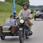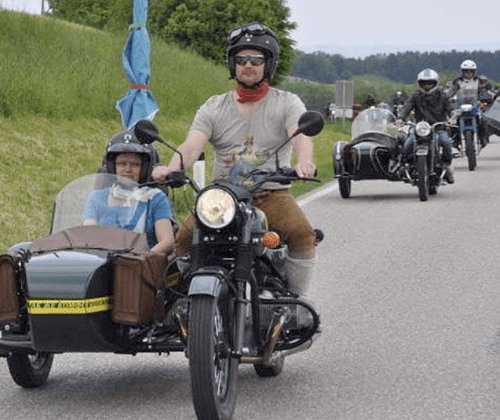 Bewohner von Assista machen im Motorrad-Beiwagen oder im Cabrio eine einstündige Fahrt durch den Hausruck.