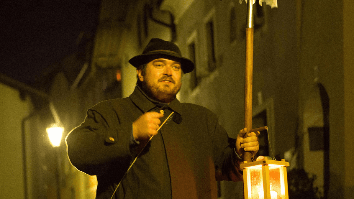 With song, wit, and all sorts of legendary tales, he lures us into a mysterious, medieval Hallein, where the night watchman was still an indispensable guarantor of the city's safety.