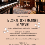 On the four Advent Sundays, a Musical Matinée will take place at the Lehár Villa at 10:30 AM. Limited number of participants: 15 people. Dates: November 30, 2025, December 7, 2025, December 14, 2025, December 21, 2025. Ralph Petruschka will perform on the two pianos at the Lehár Villa. Registration at: leharvilla@stadtmuseum.at
