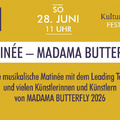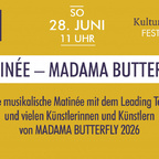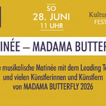 A musical matinee with the leading team and many artists from MADAMA BUTTERFLY 2026. Experience the ensemble and the leading team of our summer opera MADAMA BUTTERFLY up close. Look forward to exciting insights and background information about the upcoming premiere. An unforgettable preview of the 2026 opera season!