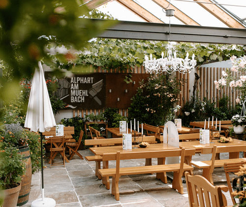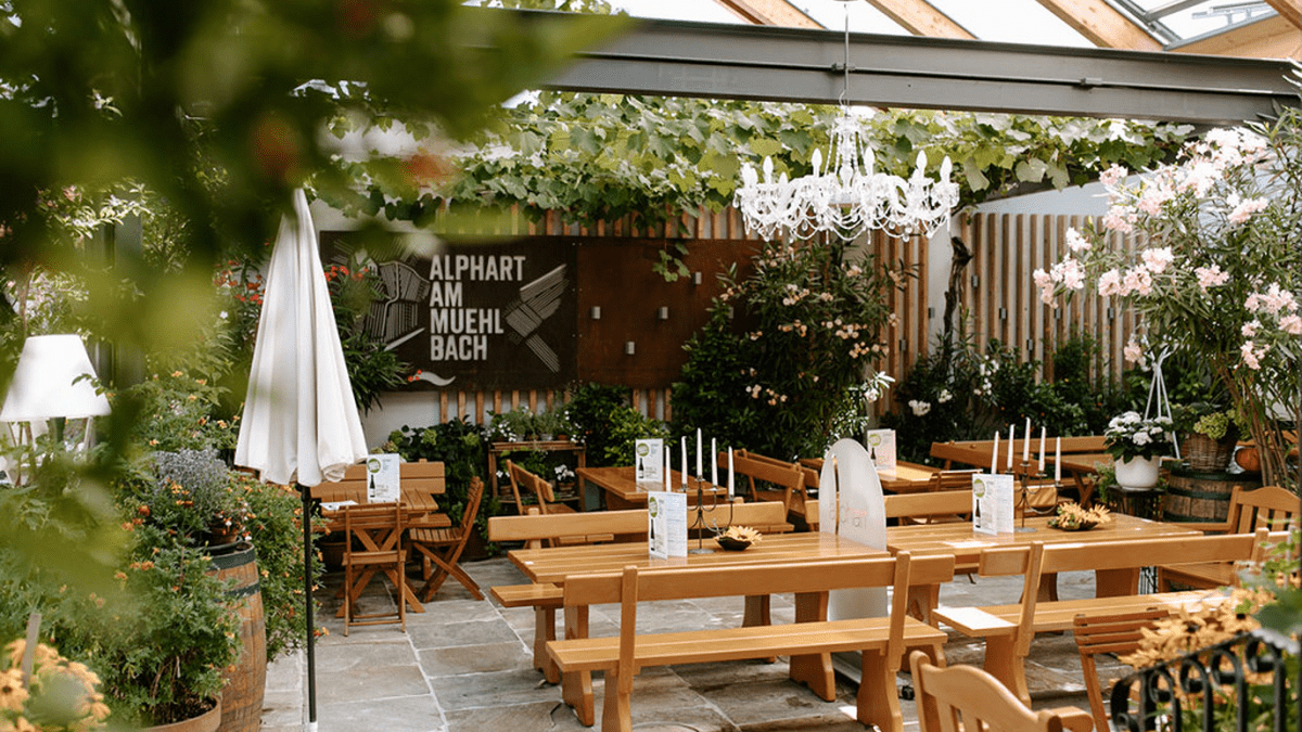 The Heurigen restaurant run by the Alphart family, located in the center of Traiskirchen, is one of those establishments that skillfully combines traditional and modern elements in the hospitality they offer their guests. The heart of the business is the Heurigen restaurant, with its many cozy dining rooms, a modern winter garden with a large fireplace, and a spacious, partially covered and heated terrace, as well as a Mediterranean garden where the numerous oleanders, citrus plants, and blooming flowers create a vacation-like atmosphere. There is also a playground for children.