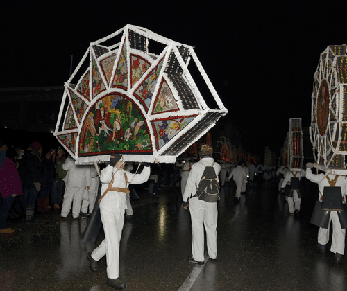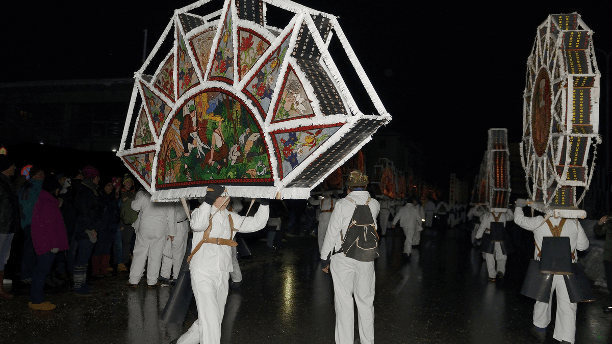 Participating in the Glöcklerlauf is quite a physical challenge for the individual cap bearers, as the Glöcklers carry caps weighing up to 20 kilograms, reaching heights of up to 2 meters and lengths of 4 meters through the town. To ensure that the evil spirits are truly driven away, the Glöcklers are strapped with large bells attached to leather belts, whose dull sound is meant to support the light.